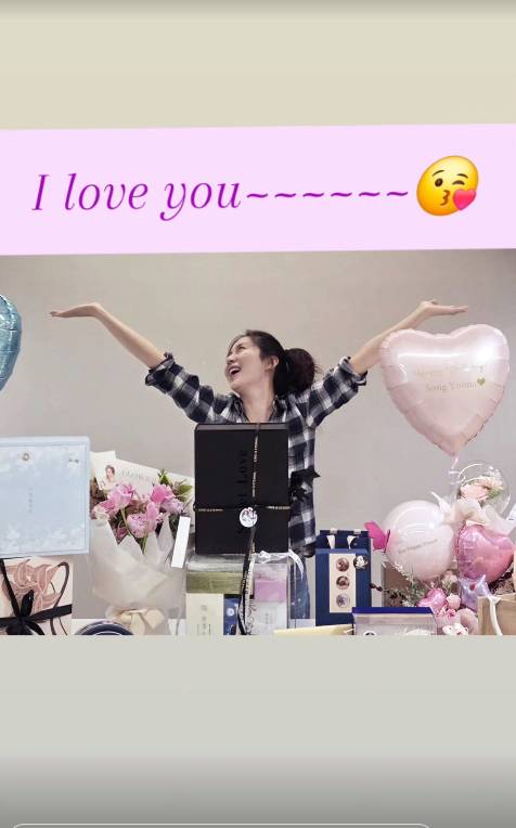 공개된 사진에는 팬과 지인들이 보낸 선물로 가득 찬 공간에서 기쁨을 만끽하는 송윤아의 모습이 담겨있다.