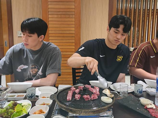 양준석은 “두바이에서는 한식을 찾기가 어려웠다. 마음을 비우고 있었는데, 이런 자리를 마련해 주셔서 정말 기쁘다”며 “팀원 모두가 행복한 마음으로 한국에 돌아갈 수 있을 것 같다”고 힘줘 말했다. 수장도 밝은 미소를 띄워 보냈다. 조 감독은 “잘하라고 만들어 주신 식사다. 기대에 부응할 수 있도록 다음 시즌 선수들과 힘을 모아 좋은 성적 낼 수 있도록 최선을 다하겠다”고 목소리를 높였다.