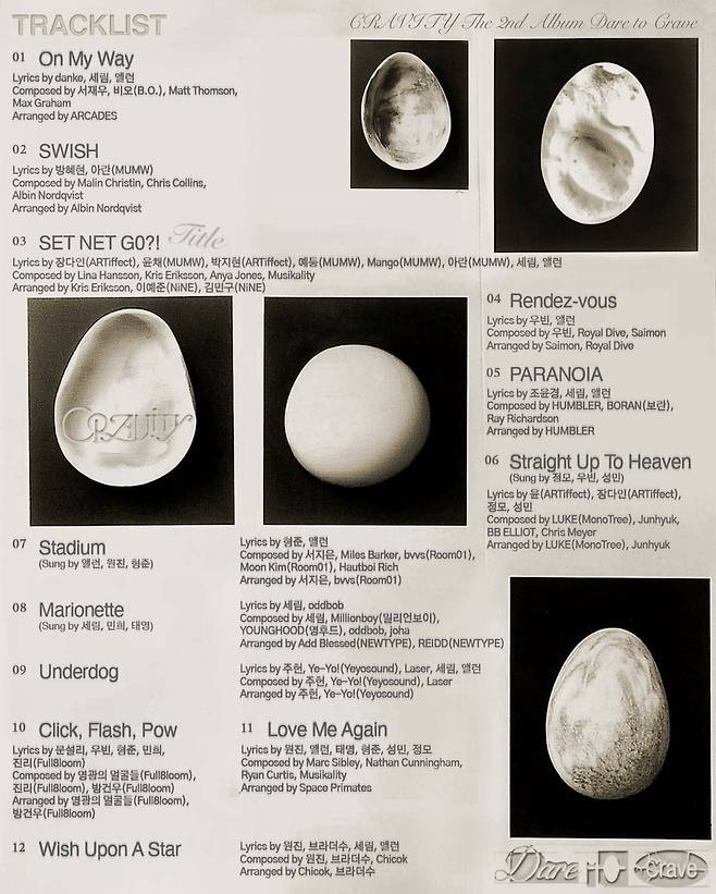 이에 따르면, 신보 ‘데어 투 크레이브’에는 타이틀곡 ‘쎗넷고?!(SET NET G0?!)’를 필두로 ‘온 마이 웨이(On My Way)’, ‘스위시(SWISH)’, ‘랑데뷰(Rendez-vous)’, ‘파라노이아(PARANOIA)’, ‘스트레이트 업 투 헤븐(Straight Up To Heaven)’, ‘스타디움(Stadium)’, ‘마리오네트(Marionette)’, ‘언더독(Underdog)’, ‘클릭, 플래시, 파우(Click, Flash, Pow)’, ‘럽 미 어게인(Love Me Again)’, ‘위시 어폰 어 스타(Wish Upon A Star)’까지 총 12곡이 수록된다.