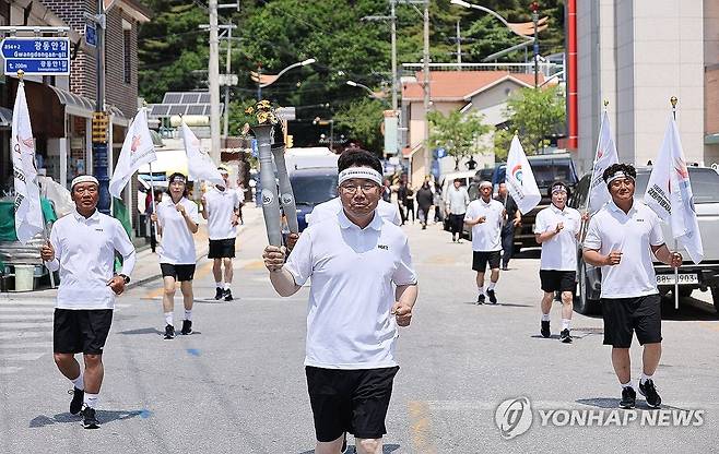 (삼척=연합뉴스) 12일 삼척에서 개막하는 '제60회 강원특별자치도민체전'의 성화가 11일 삼척시 하장면에 도착해 첫 구간 봉송을 하고 있다.