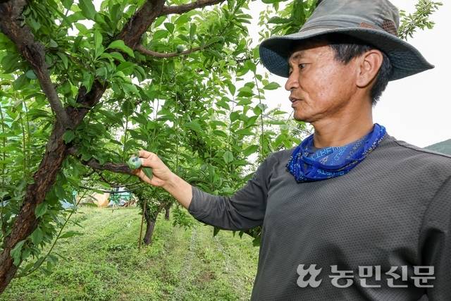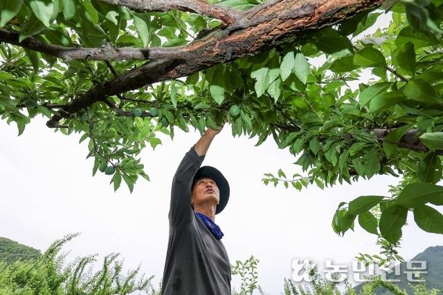 10일 경북 의성군 의성읍 오로리 김성규씨(54)가 자두밭에서 열매솎기(적과) 작업을 하고 있다. 김 씨는 “개화기 갑자기 기온이 내려가면서 착과율이 떨어졌고 우박 피해에 잉크병까지 와서 수확량은 지난해의 절반도 안될 것 같다”고 말했다.