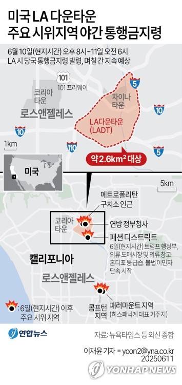 미국 로스앤젤레스(LA)에서 도널드 트럼프 행정부의 불법이민자 단속에 반발한 시위가 수일째 이어지는 가운데, LA 시 당국이 야간 소요 사태를 막기 위해 도심 일부 지역에 야간 통행금지령을 내렸다.