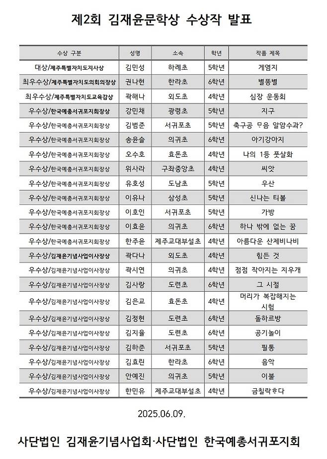 심사 결과, 23편을 수상작으로 선정했다. 하례초 5학년 김민성의 '게염지'가 대상인 제주도지사상을 수상했다. 최우수상은 한라초 6학년 권나현의 '별똥별'(도의회 의장상), 외도초 4학년 곽해나의 '심장 운동회'(교육감상)가 받았다. 한국예총서귀포지회장상과 김재윤기념사업회이사장상은 각각 10명씩 선정됐다.