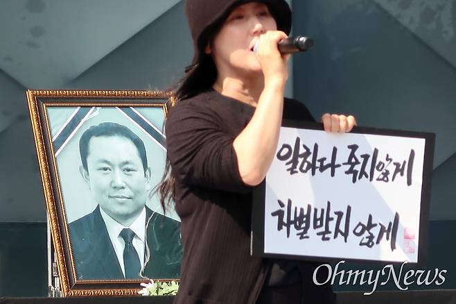 | ▲ 태안화력 고 김충현 비정규직 노동자 추모문화제가 6일 오후 3시 서울역 12번 출구 앞에서 진행됐다. 민중가수 지민주씨가 "일하다 죽지 않게 차별 받지 않게"라고 적힌 팻말을 든 채 추모공연을 하고 있다. |