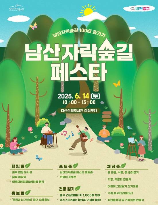 김길성 중구청장은 “자연과 도시, 문화가 공존하는 남산자락숲길의 가치를 주민들과 나누는 자리”라며 “이번 페스타를 통해 ‘명품 숲세권 중구’에 사는 자부심을 느끼는 계기가 되길 바란다”고 말했다.
