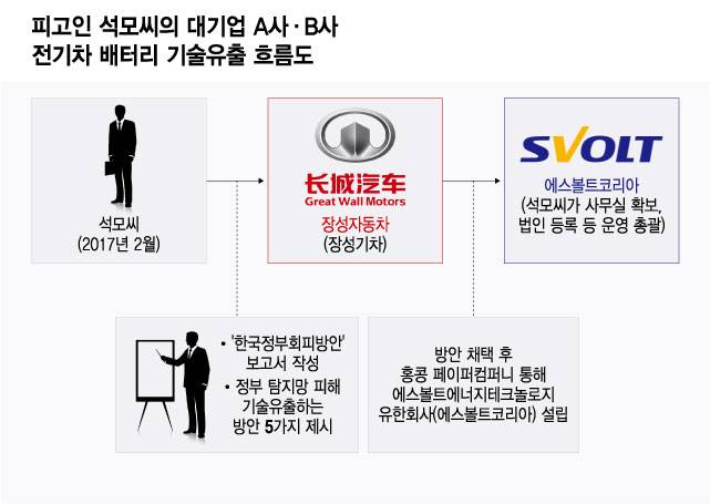 11일 검찰 등에 따르면 석씨는 2017년 2월 중국 장성차의 동력전지사업부 배터리셀사업팀에 근무하던 중 한국의 2차 전지 기술을 확보하는 방안을 본사에 제출했다.