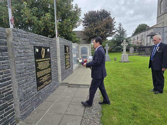 백승주 전쟁기념사업회장을 비롯한 전쟁기념사업회 대표단이 지난 10일(현지시간) 아일랜드 털레스의 성 메리 기념공원에서 아일랜드 참전용사협회(Durlás Éile Eliogarty Memorial Committee)에 기부금을 전달하고 6·25전쟁 참전용사 추모비에 헌화했다.