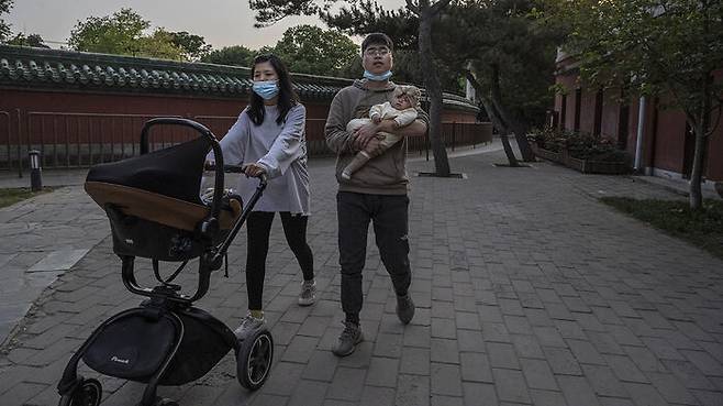 ▲ 중국 베이징의 한 공원에서 한 부부가 갓 태어난 아기를 안고 걷고 있다.