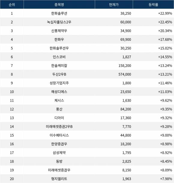 6위 인스코비(006490)는 종가 1,827원으로 14.55% 상승 마감했다. 7위 한솔케미칼(014680)은 종가 158,200원으로 13.24% 상승 마감했다. 8위 두산2우B(000157)는 종가 574,000원으로 13.21% 상승 마감했다. 9위 성창기업지주(000180)는 종가 1,800원으로 11.46% 상승 마감했다. 10위 해성디에스(195870)는 종가 23,650원으로 11.03% 상승 마감했다.