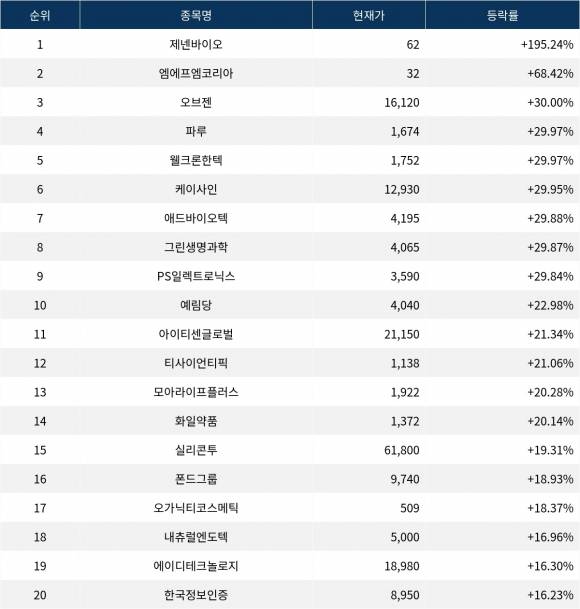 [서울데이터랩]제넨바이오 195.24% 폭등…금일 증시 상승률 1위로 마감