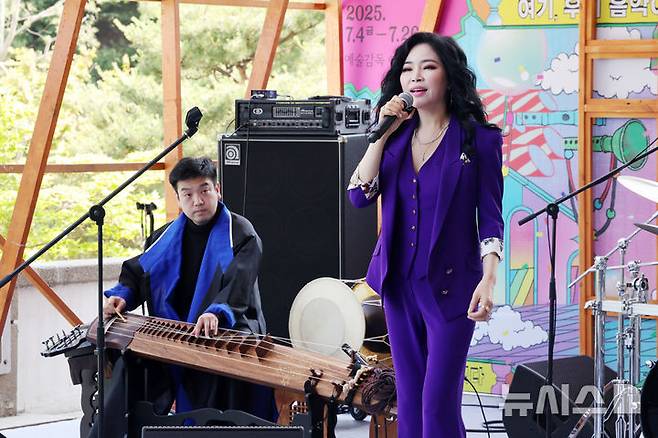 [서울=뉴시스] 박진희 기자 = 가수 웅산과 거문고주자 이재하가 11일 서울 중구 국립극장 해맞이 쉼터에서 국립극장 2025 '여우락 페스티벌' 쇼케이스를 하고 있다. 2025.06.11. pak7130@newsis.com