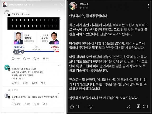 구독자 약 18만 명의 유튜버 잡식공룡은 5일 자신의 사회관계망서비스(SNS) 계정에 전남 특정 지역에서 이재명 더불어민주당 대선 후보의 득표율이 90% 가까이 나온 결과와 이를 근거로 전라도를 비하하는 발언이 담긴 게시물을 공유했다.
