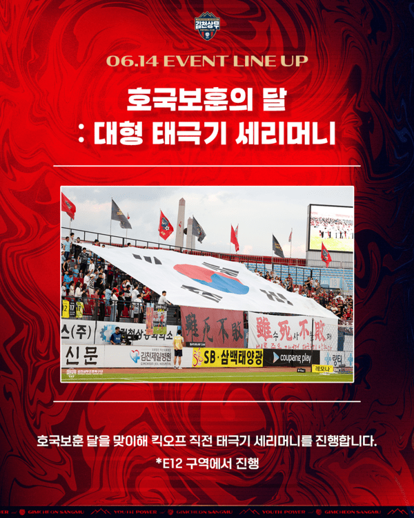 김천은 호국보훈의 달을 맞아 특별한 홈경기 이벤트를 준비했다. 호국보훈 기념 '백병전' 유니폼 출시에 맞춰 선수단이 착용 후 경기에 나선다. 킥오프 전에는 순국선열과 호국영령의 숭고한 정신을 기리는 대형 태극기 세리머니가 열린다.