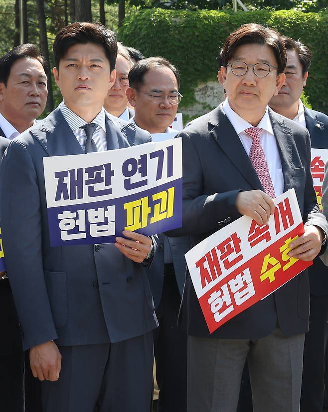 앞서 국민의힘은 이날 오전 10시 서울 서초구 서울고등법원 앞을 찾아 현장 의원총회를 열고 "이 대통령의 공직선거법 파기환송심 재판을 당장 속개하라"고 압박했다. 권 원내대표는 현장에서 가장 먼저 마이크를 잡고 발언했다.
