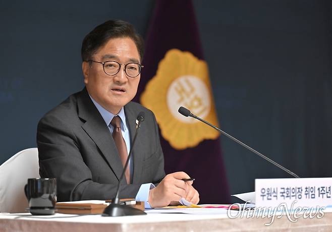 | ▲ 우원식 국회의장이 11일 오전 서울 여의도 국회 사랑재에서 취임 1주년 기자간담회를 하고 있다. |