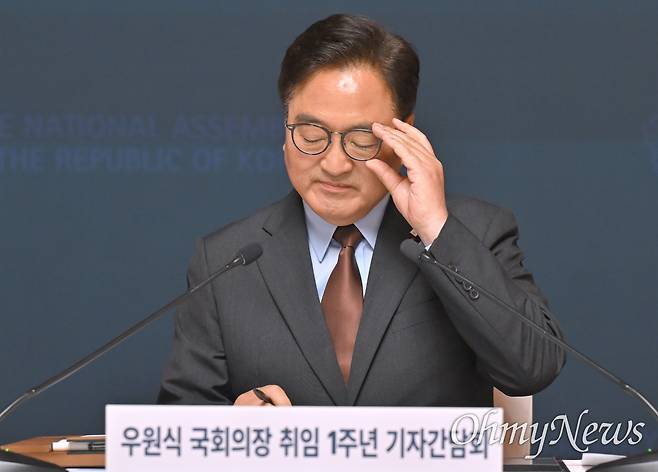 | ▲ 우원식 국회의장이 11일 오전 서울 여의도 국회 사랑재에서 열린 취임 1주년 기자간담회에서 모두발언에 앞서 안경을 고쳐쓰고 있다. |