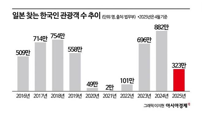 11일 법무부에 따르면 올해 일본에 입국한 한국인 방문객 수는 4월 기준 322만7758명으로 집계됐다. 올해 4월까지 해외로 나간 우리 국민은 총 994만6098명으로 출국자 3명 중 1명은 일본을 목적지로 삼은 것이다. 특히 올해 일본을 찾은 우리 관광객은 지난해 같은 기간(299만9962명)보다 7.6% 증가해 역대 최대 인원을 다시 경신했는데, 이는 전체 해외 관광객 증가율(4.3%)을 상회하는 수치다.