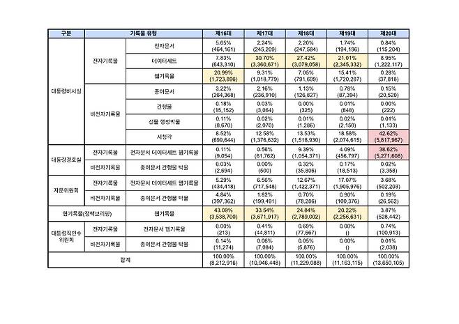 그런데 이번 이관 수량을 보면 매우 이례적인 패턴이 확인되었다. 대통령비서실 시청각 기록물은 제19대 대비 2배 이상 증가해 581만 건에 달하며 전체 기록물의 42.6%를 차지했다. 대통령경호처 전자기록물 역시 11배 이상 급증해 527만 건에 이르렀다.