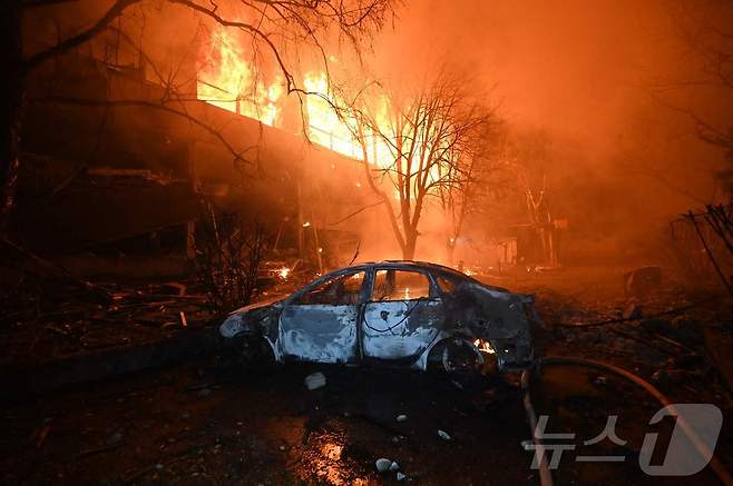 (하르키우 AFP=뉴스1) 최종일 선임기자 = 11일(현지시간) 러시아의 드론 공격으로 우크라이나 하르키우에 있는 한 건물에 화재가 발생했다. 건물 앞에 불 탄 자동차가 보인다. 2025.06.11