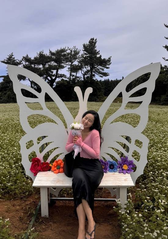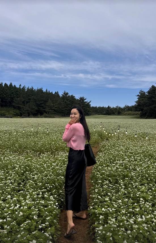 자연스럽게 풀어 내린 웨이브 헤어와 블랙 숄더백, 브라운 컬러의 슬리퍼 샌들로 스타일링을 마무리했다. 특히 짙은 녹음과 순백의 메밀꽃밭이 어우러진 배경 속에서 박지윤의 밝은 미소와 컬러감 있는 의상이 돋보이며, 한 폭의 화보 같은 분위기를 완성했다.