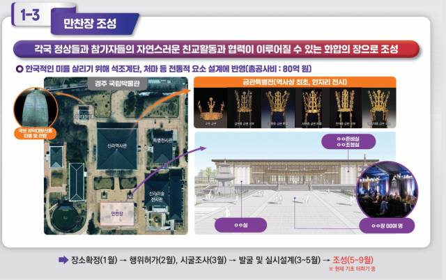 부지선정 절차가 지연돼 한 때 우려를 사기도 했던 만찬장의 경우엔 현재 부지 정지 작업이 진행 중이다. 도는 다른 시설과 마찬가지로 9월 중순 내에 공사가 완료될 것으로 보고 있다. 국립경주박물관 중정에 조성되는 만찬장은 한국적 미를 살린 석조계단·처마 등 전통적 요소를 설계에 반영한 것이 가장 큰 특징이다. 특히 정상회의 기간, 성덕대왕 신종(에밀레종) 타종, 국보로 지정된 천마총·금관총 금관 등 특별전시전도 함께 열릴 예정이다.