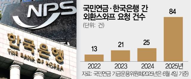 11일 서울경제신문 취재에 따르면 국민연금이 한국은행에 외환스와프를 위해 자금 이체 협조 요청을 한 횟수는 올해 1월부터 이달 4일까지 약 84건으로 파악됐다. 지난해에는 1년간 25건 수준으로 스와프가 이뤄졌는데 반 년 만에 전년의 3배를 넘긴 것이다.