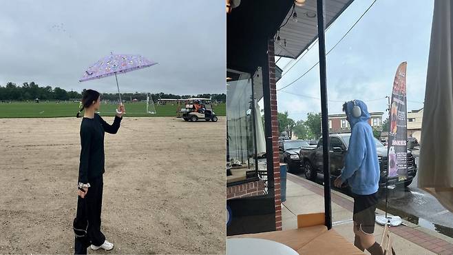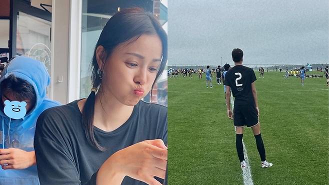 또 다른 사진에서는 카페에서 잠시 휴식을 취하는 모습과 아들 룩희 군의 축구 경기를 관람하는 장면이 담겼다. 룩희 군은 182cm의 훤칠한 키와 또렷한 이목구비로 시선을 사로잡았다.