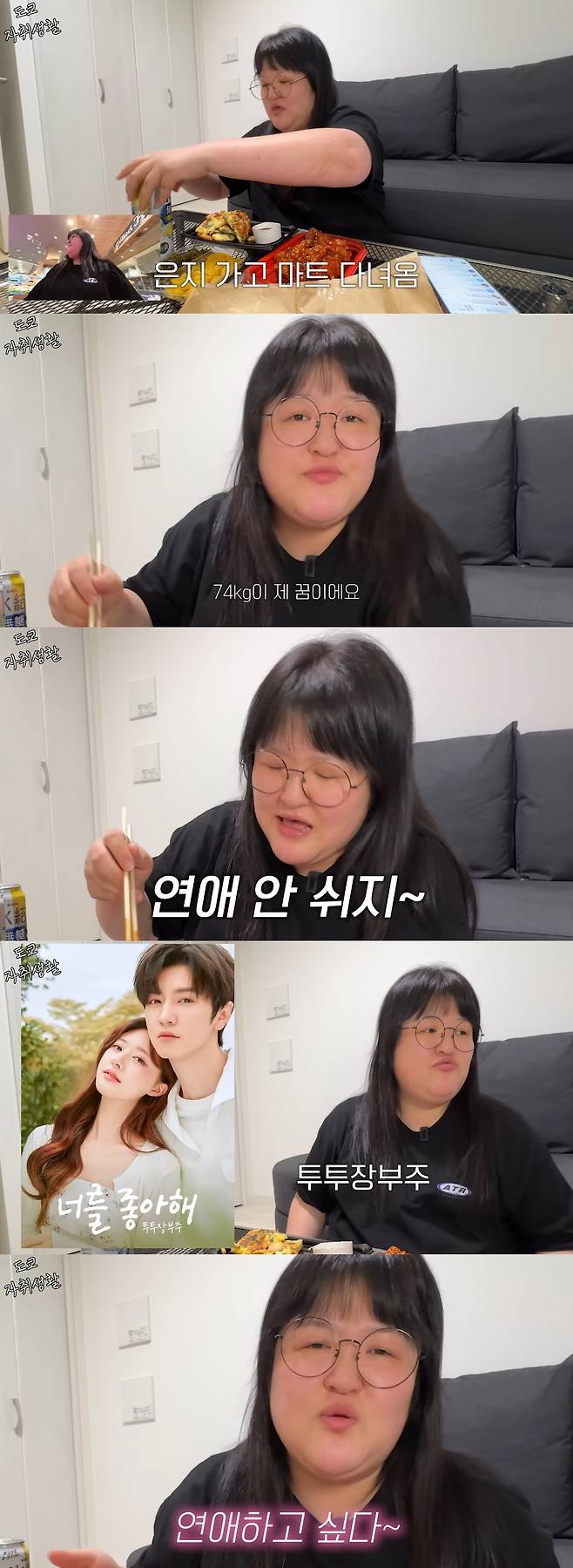 알코올 도수 7도, 4도짜리 술을 마시던 이국주는 "74kg이 내 꿈이다. 지금 74kg였으면 연애 안 쉰다"며 너스레를 떨었다.