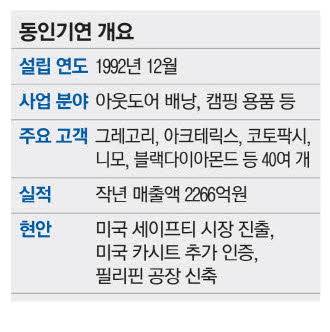 최근 서울 방화동 서울사무소에서 만난 정인수 동인기연 대표는 "5000m 넘는 산에 가는 산악인을 위한 가방은 인체공학적인 디자인, 최적의 무게중심, 경량화에 집중해야 한다"며 "우리는 자체 연구개발(R&D) 역량으로 고객사 문제를 해결하기 때문에 세계적인 회사들이 직접 찾아온다"고 강조했다.