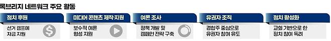 록브리지는 활력을 잃은 기존 공화당을 대체하는 신보수의 정치적 기반을 구축하겠다는 목표로 창립됐다. 2만5000달러를 내면 모임에 참여할 수 있고 종신 회원비는 100만달러(약 14억원)다. 정치인 후원, 여론 형성, 유권자 조직 등 다양한 정치 활동에 연간 7500만달러가량의 예산을 운용한다.