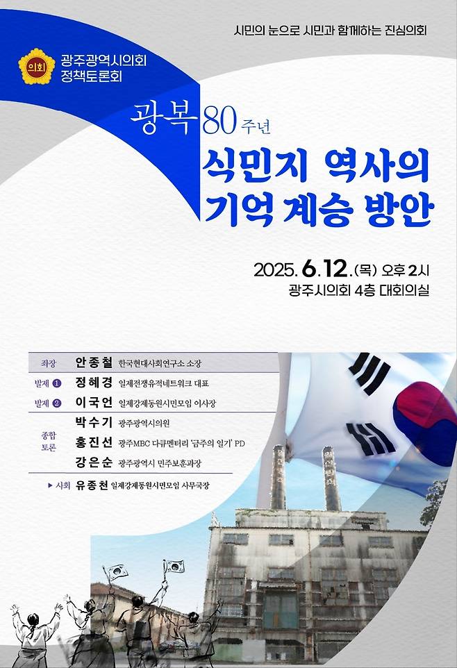 광주시의회는 12일 오후 2시 의회 4층 회의실에서 '광복 80주년 식민지 역사의 기억 계승 방안'을 논의하는 정책토론회를 연다.