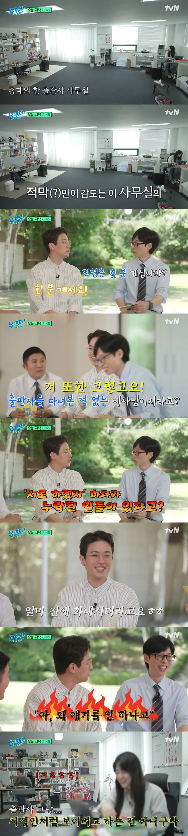 이에 MC 유재석이 "출판사를 다녀본 적 없는 이사님이라 서로 '알아서 하겠지' 하다가 일이 누락되는 경우도 있다고 하던데요"라고 묻자, 박정민은 "저도 출판사에서 일해본 적이 없다. 누락된 일이 정말 많다. 얼마 전엔 이사님께서 '왜 얘기를 안 하냐'며 화를 내시기도 했다"며 솔직하게 털어놔 웃음을 더했다.