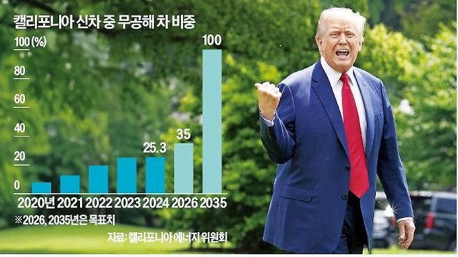캘리포니아주는 조 바이든 행정부 시절 연방 환경보호청(EPA) 승인 아래 연방정부보다 훨씬 높은 기준의 환경 규제를 도입했다. 2035년까지 판매되는 신차의 80%는 전기차, 나머지 20%는 플러그인하이브리드 차량으로 채우도록 정했다. 캘리포니아주에 등록된 신차 중 무공해 차량(전기차, 하이브리차 등) 비중은 2020년 7.8%에서 지난해 25.3%로 높아졌다.