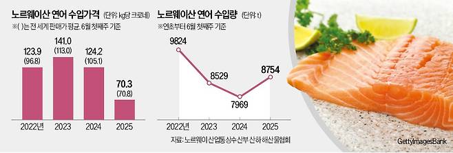 11일 노르웨이 산업통상수산부 산하 해산물협회에 따르면 이달 첫째주 한국에 수출된 연어 가격은 ㎏당 70.3크로네(약 9557원)였다. 1년 전(124.2크로네)보다 43.2% 떨어졌다. 2년 전과 비교하면 반토막이 났다. 한국이 수입한 연어 가격(6월 첫째주 기준)은 2022년 123.9크로네에서 2023년 141.0크로네까지 치솟기도 했다.