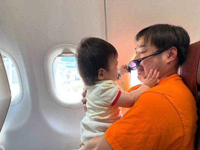 사진 속에는 비행기에서 행복한 시간을 보내고 있는 아빠와 아들의 모습이 담겨있다. 아들 현조 군과 첫 해외여행을 떠나는 강재준, 이은형 부부.