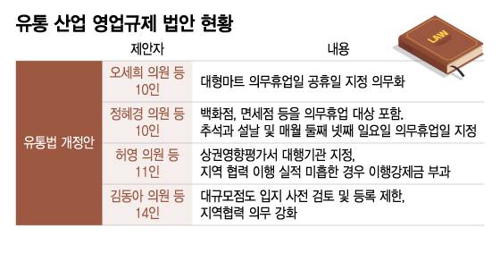 여권에서 대형마트 의무휴업일을 공휴일로 의무 지정하는 법안을 재추진한다는 소식이 알려지자 반발 여론이 확산되고 있는 가운데 이보다 더 강력한 유통업 규제 법안이 국회 상임위원회에 계류 중인 것으로 확인되면서 논란이 예상된다.