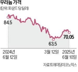 10일(현지시간) 트레이딩이코노믹스에 따르면 우라늄 현물 가격은 이날 파운드당 70.05달러에 마감했다. 올해 3월 13일 기록한 연 저점(63.5달러)보다는 10.1% 오른 수준이지만 연초 가격(약 74달러)에는 못 미친다. 지난해 1월 15일 종가(106달러)와 비교하면 30% 이상 하락했다. 트럼프 대통령의 행정명령 서명 이후 원전과 관련한 기업 및 상장지수펀드(ETF) 주가가 치솟은 것과 대조적이다.