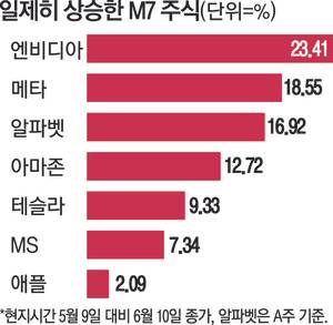 엔비디아(23.41%), 메타(18.55%), 알파벳(16.92%)의 상승률이 두드러졌으며 아마존(12.72%)과 테슬라(9.33%)도 10% 안팎으로 올랐다.