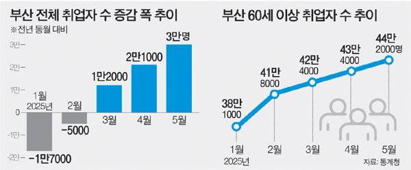 통계청은 “인구 고령화 등으로 노인 취업자 수가 증가하는 추세”라고 분석했다. 반면 지난달 부산 15~29세 청년층 취업자(20만9000명)는 1년 전 같은 달보다 1만9000명 감소했다. 40대도 2000명 줄었다. 30대와 50대 취업자는 각각 5000명, 1만5000명 늘었다.