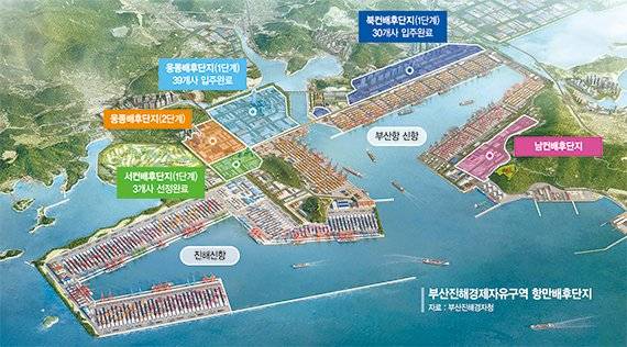 경자청은 적기에 용지를 공급하기 위해 개발에 박차를 가하고 있다. 부산항 신항을 중심으로 5곳, 약 970만㎡ 규모의 배후단지를 조성 또는 개발 중이다. 개발을 완료한 웅동배후단지(1단계)에는 39개사, 북컨배후단지(1단계)에는 30개사 등 총 69개사가 입주해 운영 중이다.