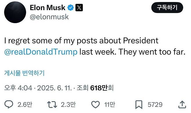 머스크는 미국 동부 현지 시간으로 11일 새벽 4시경 자신의 소셜 미디어 X에서 "트럼프 대통령에 대해 지난 주 쓴 일부 게시글에 대해 후회한다"며 "그건 너무 심했다"고 적었다.