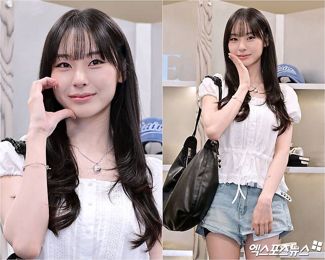 이날 노제는 순백의 퍼프 블라우스에 연청 데님 숏팬츠를 매치해 청량한 여름 스타일링을 완성했다. 허리 스트랩 디테일이 강조된 블라우스는 그녀의 슬림한 실루엣을 부각시켰고, 데님 숏팬츠는 캐주얼한 무드를 더했다.