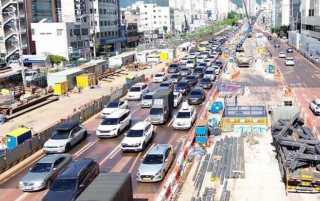 | 광주 도시철도 2호선 1단계 구간 개통 시점이 늦춰질 것으로 예상되는 가운데 11일 오후 남구 백운광장 일대 도로가 공사 여파로 꽉 막혀 있다./김애리 기자·조영권 인턴 기자 |