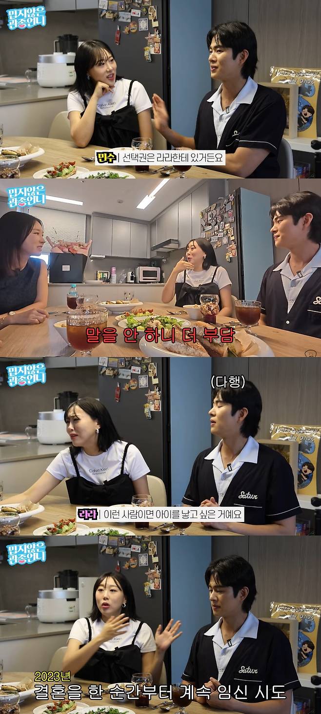 이어 임라라는 "하필 남편을 만났는데 너무 가정을 꾸리고 싶어 하는 로망이 큰 남편인데, 착해서 나한테 부담은 안 줘"라고 털어놨고, 손민수는 "저는 그렇게 하고 싶었지만 선택권은 라라한테 있었다"라고 덧붙였다.