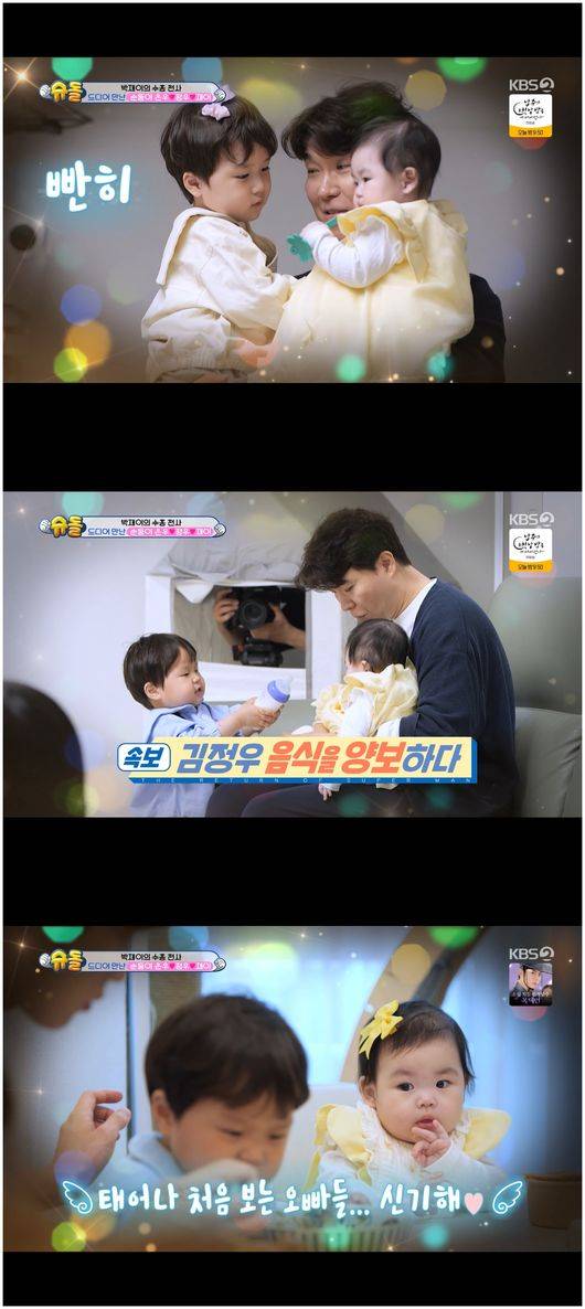 11일 방영한 KBS2TV 예능 '슈퍼맨이 돌아왔다'(이하 '슈돌')에서는 은우, 정우 형제를 사윗감으로 탐내던 박수홍이 딸 재이를 이들 형제에게 소개해주었다.
