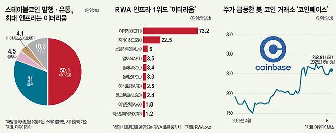 최근 코인 시장에서 가장 뜨거운 화두 중 하나인 RWA(실물자산토큰·잠깐용어 참조)도 스테이블코인 성장에 영향을 받을 것으로 보인다. RWA는 ‘코인을 활용한 조각 투자’라고 이해하면 쉽다. 스테이블코인 상용화는 부동산·채권 같은 전통 금융자산을 블록체인 기반으로 거래할 때 진입장벽을 낮춘다. RWA에서 가장 많이 사용되는 네트워크 역시 이더리움이다. RWA 전문 분석 플랫폼 RWA.xyz에 따르면 6월 4일 기준 RWA 총가치가 가장 큰 네트워크 1위는 이더리움(약 73억달러)이고 뒤를 이어 지케이싱크(ZKsync)가 약 22억달러로 2위, 스텔라루멘·앱토스·솔라나가 나란히 3·4·5위를 차지했다.