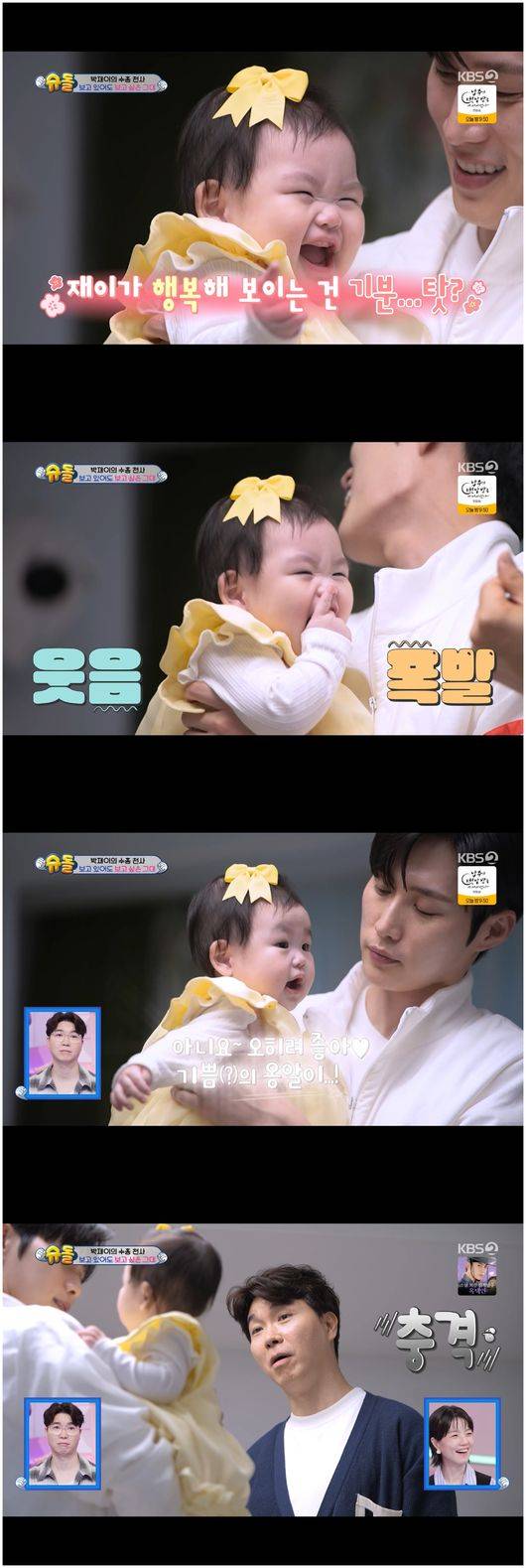 박수홍은 "아빠 말고는 다른 사람에게 팔을 뻗는 경우가 별로 없는데"라고 말하다가 김준호에게 안긴 채 아빠에게 안 가겠다고 고개를 돌린 채 김준호를 보며 너무나 행복하게 웃음을 터뜨리는 재이를 보면서 크나큰 충격에 빠졌다.