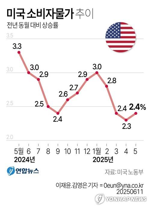 (서울=연합뉴스) 이재윤 김영은 김민지 기자 = 미국 노동부는 5월 미국 소비자물가지수(CPI)가 전년 동월 대비 2.4% 상승했다고 11일(현지시간) 밝혔다. 전월과 비교해선 0.1% 상승했다.