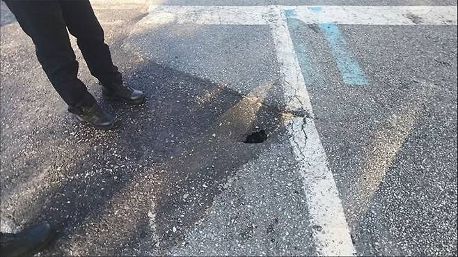 소방당국과 동부도로사업소 등에 따르면 오늘(11일) 오후 5시 46분쯤 강남경찰서 사거리 부근 도로에서 지름 약 40cm, 깊이 약 30cm 규모의 침하 현상이 발생했습니다.
