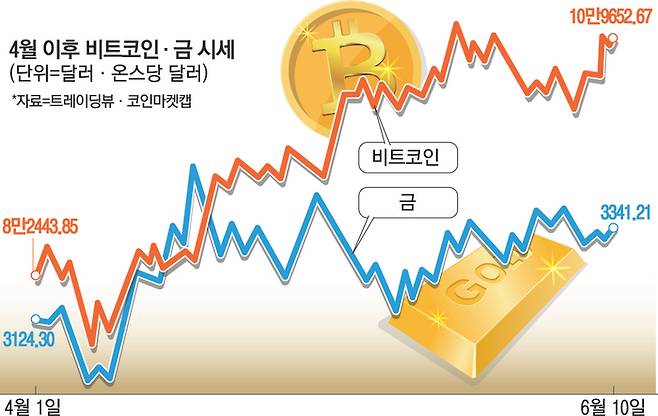 '디지털 금' 비트코인이 사상 최고가를 경신했던 지난 5월 이후 실물 금 상장지수펀드(ETF)에선 자금이 빠져나가고 비트코인 현물 ETF에는 유입되는 흐름이 나타났다.